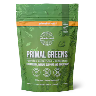 Primal Greens by Primal Harvest features over 50 fruits, vegetables, herbs, spices, and mushrooms. It delivers a wide range of superfoods and nutrients with just one scoop per day. It's sweetened with plant-derived sweetener and provides 2.4 g of dietary fiber, as well as 1 billion CFUS of probiotics.