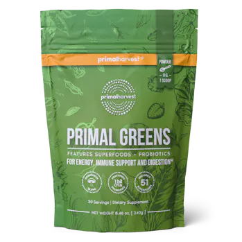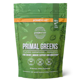 Primal Greens by Primal Harvest features over 50 fruits, vegetables, herbs, spices, and mushrooms, delivering a variety of superfoods and nutrients with just one scoop per day. It's sweetened with plant-derived sweetener and provides 2.4 g of dietary fiber, as well as 1 billion CFUS of probiotics.