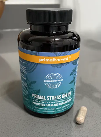 Primal Stress Relief by Primal Harvest features a blend of ingredients including the adaptogens ashwagandha and rhodiola, the amino acid L-theanine, vitamin B6, and cocoa bean extract (theobromine). This formula contains a unique blend of active ingredients found in ashwagandha thanks to the cutting-edge Prolanza™ Ashwagandha Root Extract, a clinically-tested ashwagandha extract that was shown to support stress management, sleep quality, memory, and focus in a randomized, double-blind, placebo-controlled study.*