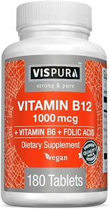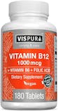 Vitamin B12 1,000 mcg by Vispura is a B12 tablet that also includes vitamin B6 and folic acid. This formula delivers vitamin B12 in the form of methylcobalamin but doesn’t include any minerals or other vitamins than the ones mentioned above. It comes in a bottle of 180 tablets and has a serving of one capsule per day.